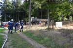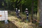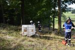 - Ein vom Lkw gestürzter Container mit einer brennbaren Flüssigkeit dessen Inhalt auf Grund eines Leckes bereits austrat und zu brennen begonnen hatte.