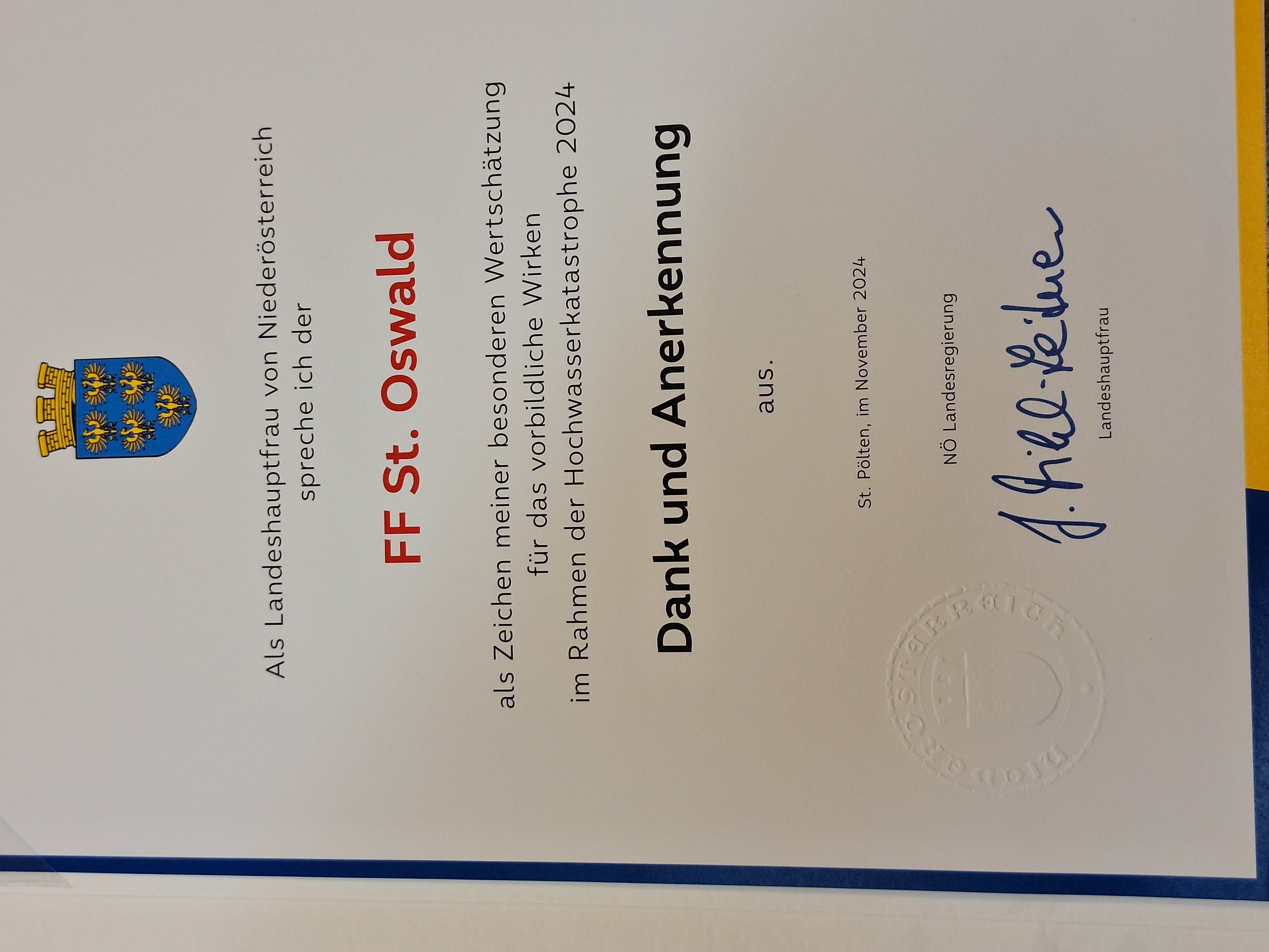 Im Zuge des Katastropheneinsatzes unterstützten die Mitglieder der FF St. Oswald an mehreren Tagen die Feuerwehren im Bezirk bei der Beseitigung der Unwetterschäden. Als sichtbares Zeichen des Dankes und der Anerkennung verlieh der NÖ Landesfeuerwehrverband die Katastropheneinsatzmedaille für diesen vorbildlichen Einsatz zum Wohle der Allgemeinheit.